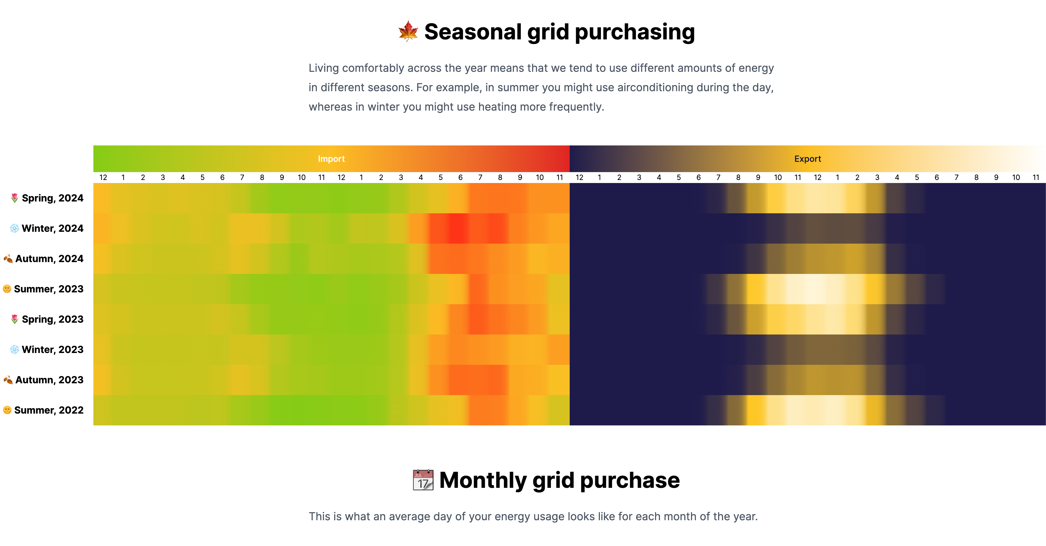 We use your smart meter data to create clear and insightful ways to understand when you're using 🔌 and generating power 🌞 so you can live more comfortably for less.